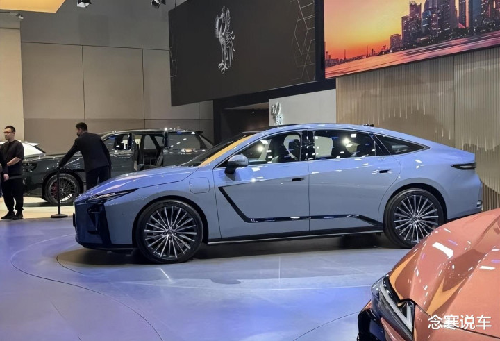 侧面线条更明显,溜背造型都出来了,配合那个L型的黑色装饰条,确实运动感拉满了。轮毂尺寸也不小,多辐条的设计嘛,算是保留了一点商务豪华的意思,不至于太“过”。