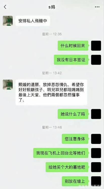 前不久,网上流出了S妈和前夫汪小菲的聊天记录,声称大S临走之前的遗愿是希望所有人放下仇恨,让汪小菲照顾两个孩子。